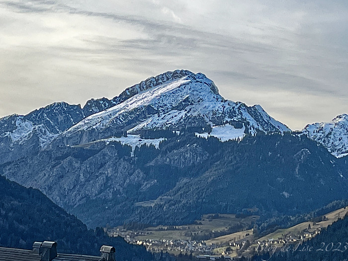 Après quelques chutes de neige en altitude, si nous avons skié dans le brouillard le matin, le soleil est revenu dans l’après-midi… (au fond de la vallée, les Cornettes de Bise).