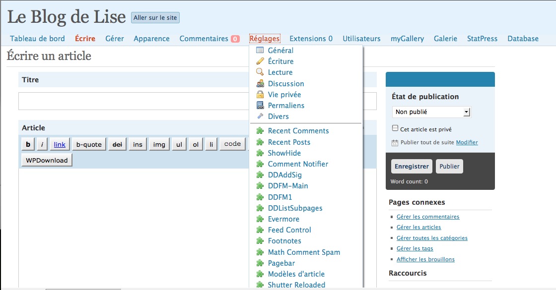Une fois le plugin téléchargé dans wp-content/plugins, on accède aux réglages depuis le panneau des Extensions.