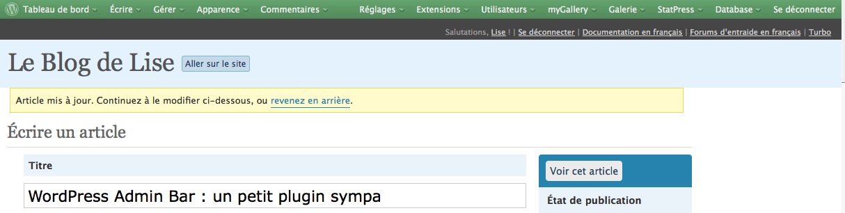 Résultat (tout à fait personnel) de ce test : Admin Bar est maintenant en fonction sur mon site. Argh, chacun devra faire son choix ! 🙂