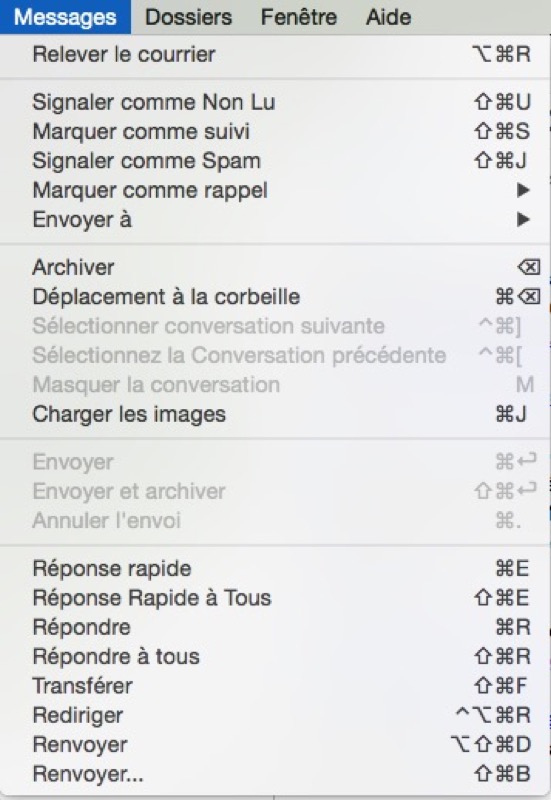 • la combinaison de touches Commande + <- permet de placer le message sélectionné dans la corbeille ;
