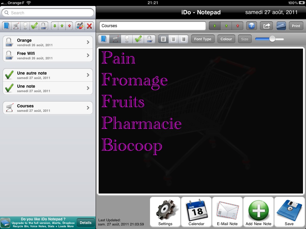 iDo Notepad, compatible iPhone et iPad, permet notamment de classer ses notes, de choisir pour chaque note la police, la couleur de la police et du fond, l’alignement du texte, la taille de la police. L’application dispose d’une barre de recherche, on peut regrouper les notes par catégories, définir une priorité pour chacune. Un tap sur l’icône dédiée permet d’afficher la note en plein écran. Il existe une touche permettant d’insérer une tabulation.