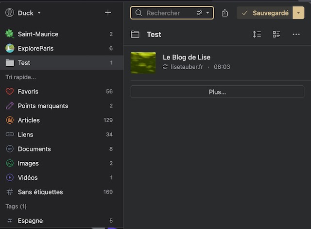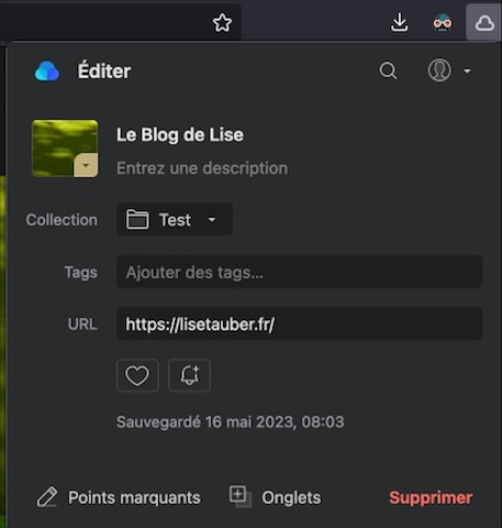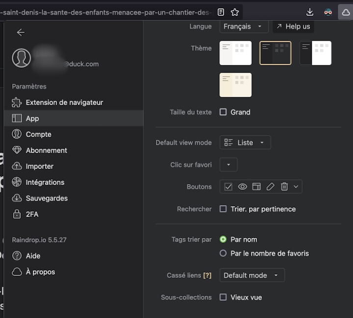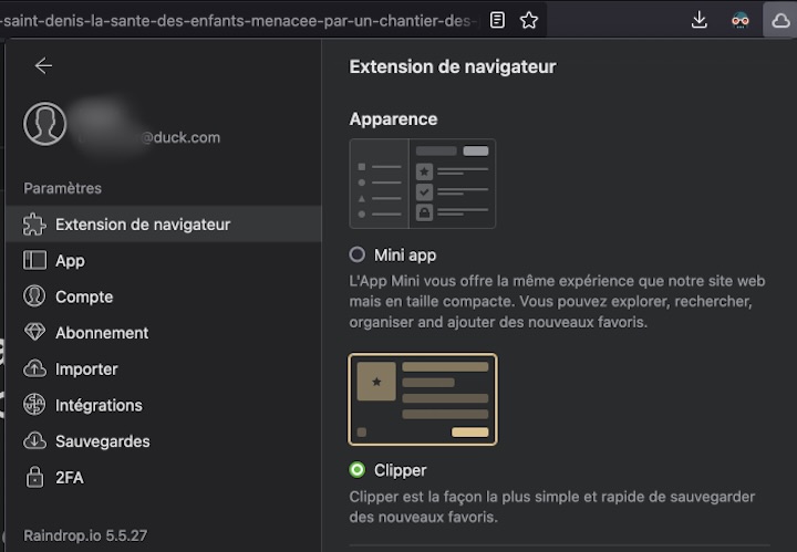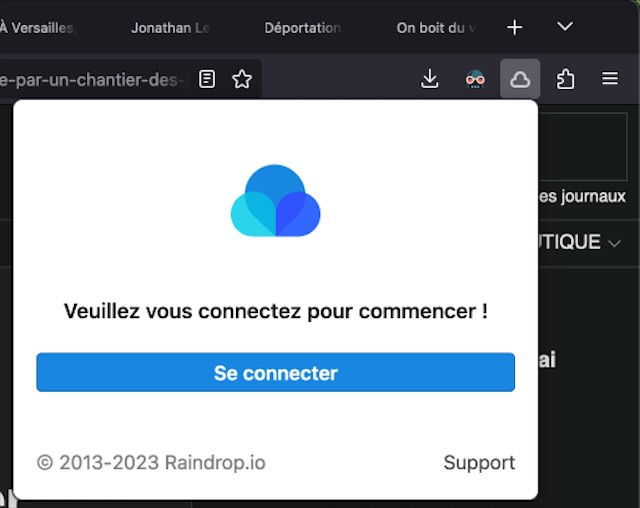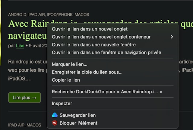 J’ai installé également Raindrop.io (3) qui permet de sauvegarder les pages à lire plus tard. Différentes options sont disponibles, comme la taille de la fenêtre pour enregistrer un lien. On peut également d’un simple clic droit sauvegarder un lien (dernière image). En plus d’enregistrer les pages à lire plus tard, Raindrop.io permet de les consulter sur un autre appareil, iOS, iPadOS ou Android par exemple.