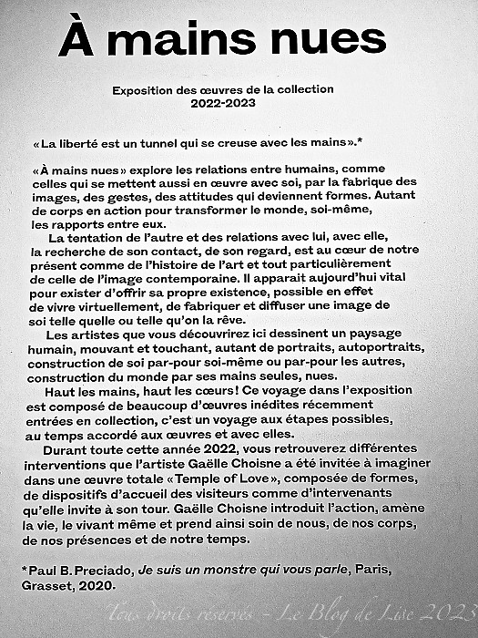 J’ai participé mi-janvier à une visite guidée au Mac Val, le musée d’art contemporain, situé à Vitry-sur-Seine dans le Val-de-Marne, autour de l’exposition À mains nues. Il s’agit d’une exploration de l’humain autour du corps, et ses parties, ainsi que des relations sociales. Il s’agit d’une exploration des relations entre les êtres, avec soi-même, des gestes, des « attitudes qui deviennent formes ».