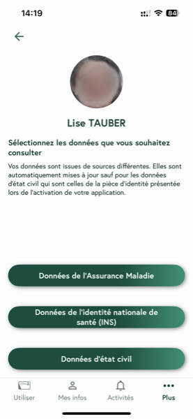 Dans l’application carte Vitale sont stockées les données de l’assurance maladie, celles de l’identité nationale et de l’état civil, ainsi que sa photo, récupérée depuis l’application France Identité et non pas celle présente sur la carte Vitale physique (voir les conditions générales).