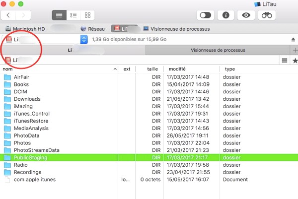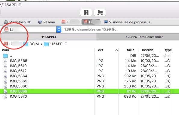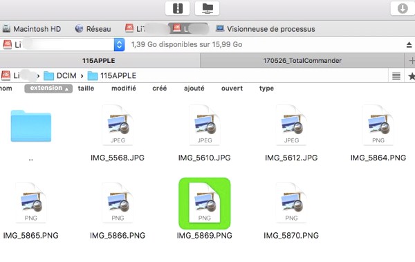 L’accès aux smartphones est immédiat avec une connexion en USB. L’icône de l’iPhone, de l’iPad ou du téléphone sous Android s’affiche en rouge. On accède ainsi directement au contenu du téléphone. Si on accède bien aux fichiers de l’iPhone, les vignettes n’affichent pas les images (dernière image).