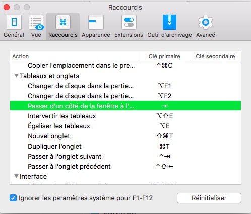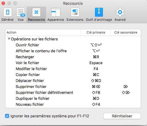 Avec Commander One, on peut facilement basculer vers l’affichage des fichiers cachés. Dans les préférences de l’application, on peut également modifier tous les raccourcis clavier. Pour ma part, j’ai recréé pour partie les mêmes qu’avec le Finder, histoire de ne pas m’emmêler les pinceaux 😉