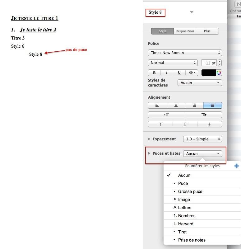 J’ai alors créé un document sous Word utilisant tous les styles que je voulais employer. J’ai ensuite effectué un copier/coller du texte depuis Word vers Pages.