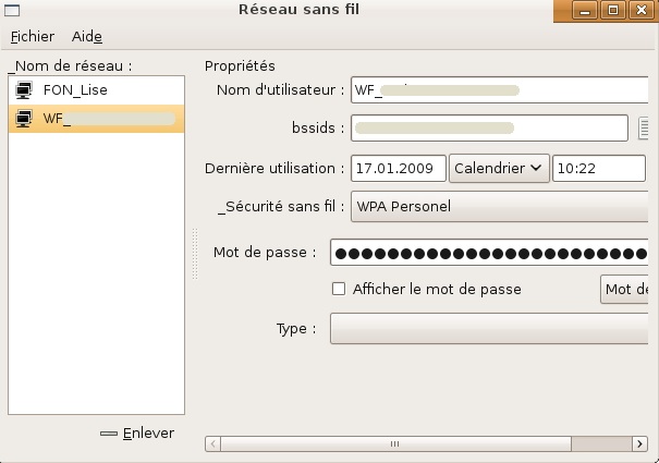 - dans la fenêtre Réseau sans fil, choisir un des réseaux sans fil précédemment utilisé,
