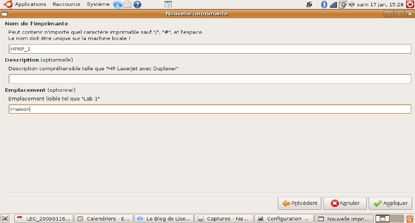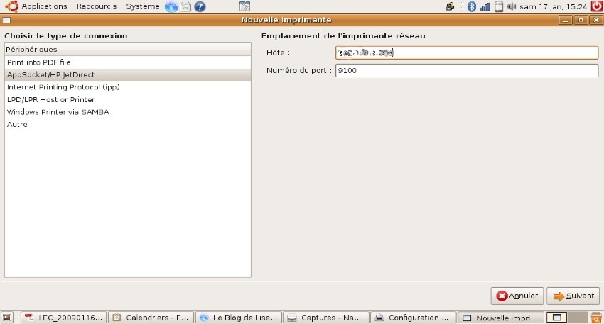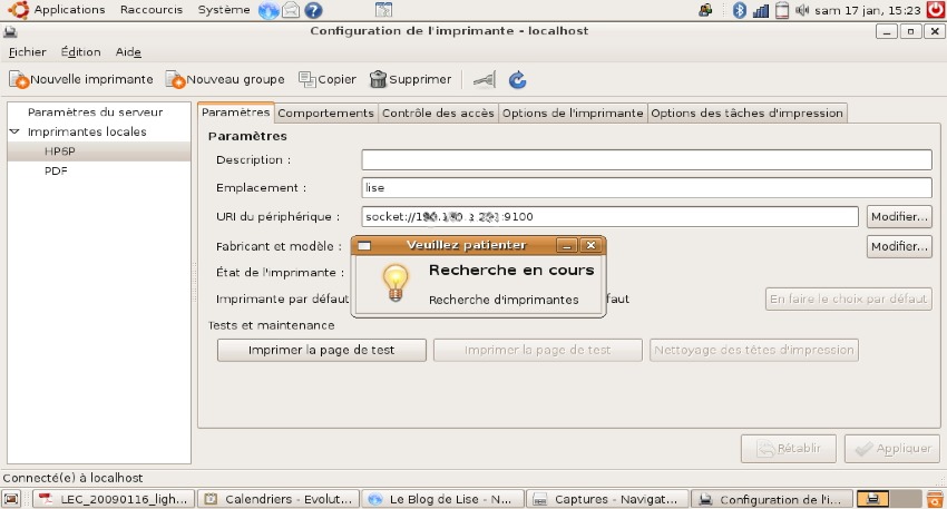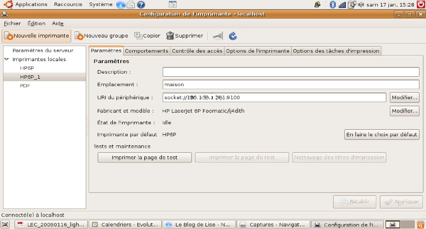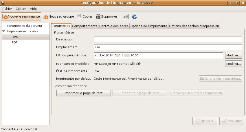 Je dispose d’une vieille imprimante Laser, branchée sur un serveur d’impression via le port parallèle et un adaptateur USB. La connexion depuis mes Macs est un peu capricieuse, sous Ubuntu, ça fonctionne ! même s’il faut attendre un petit moment que la transmission des données s’effectue.