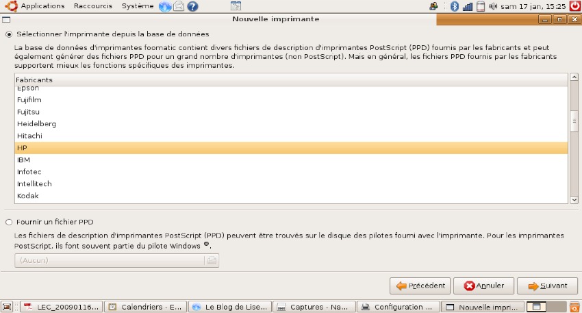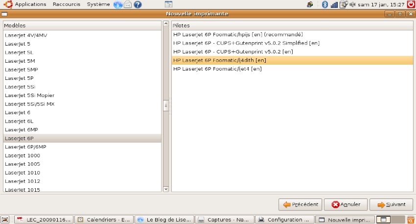 - sélectionner la marque de l’imprimante, puis l’imprimante et son pilote (j’ai choisi un peu au hasard le pilote HP Laserjet 6P Footmatic) ;