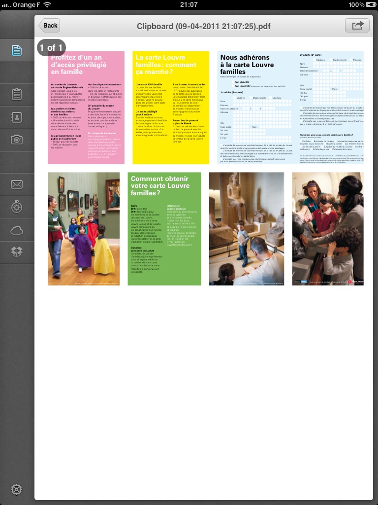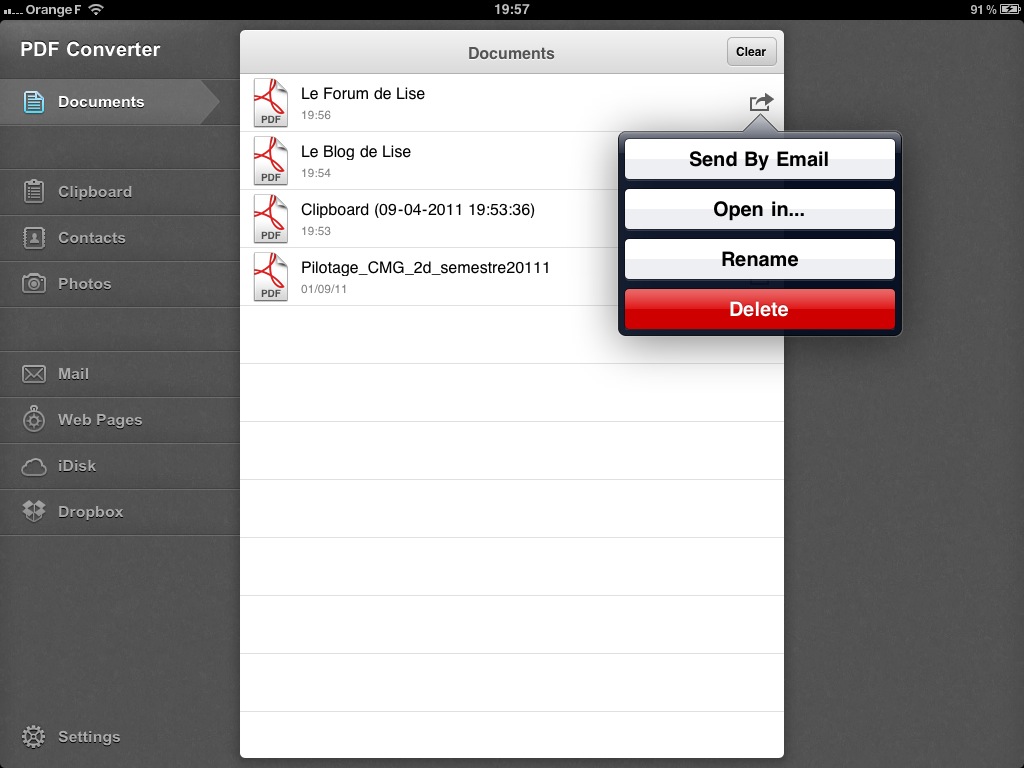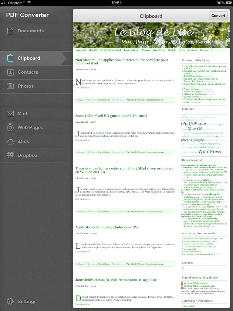 PDF Converter est une application commerciale de la société Readdle, dont j’ai déjà décrit ici plusieurs logiciels. Elle est certes un peu chère (5,49 €) mais permet de convertir tout type de fichier au format PDF : documents Word, Excel, texte,… contenu du presse-papier, contacts, photos, pages web (en saisissant dans la barre d’adresse pdfhttps://xxxxx)