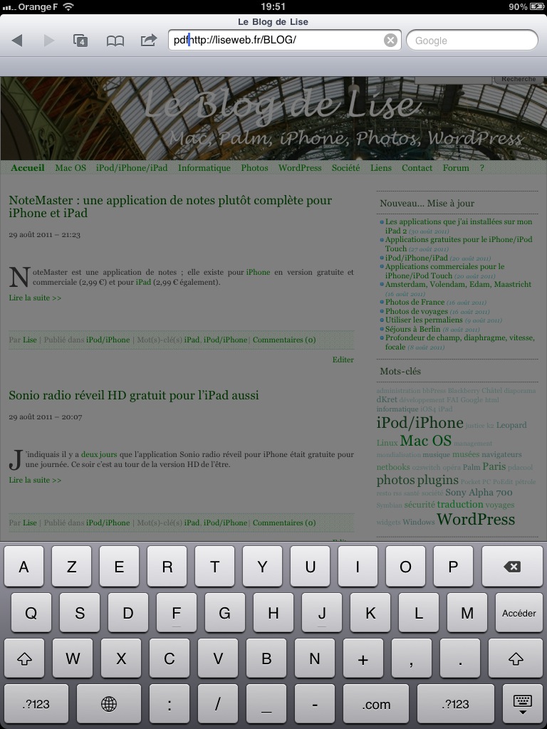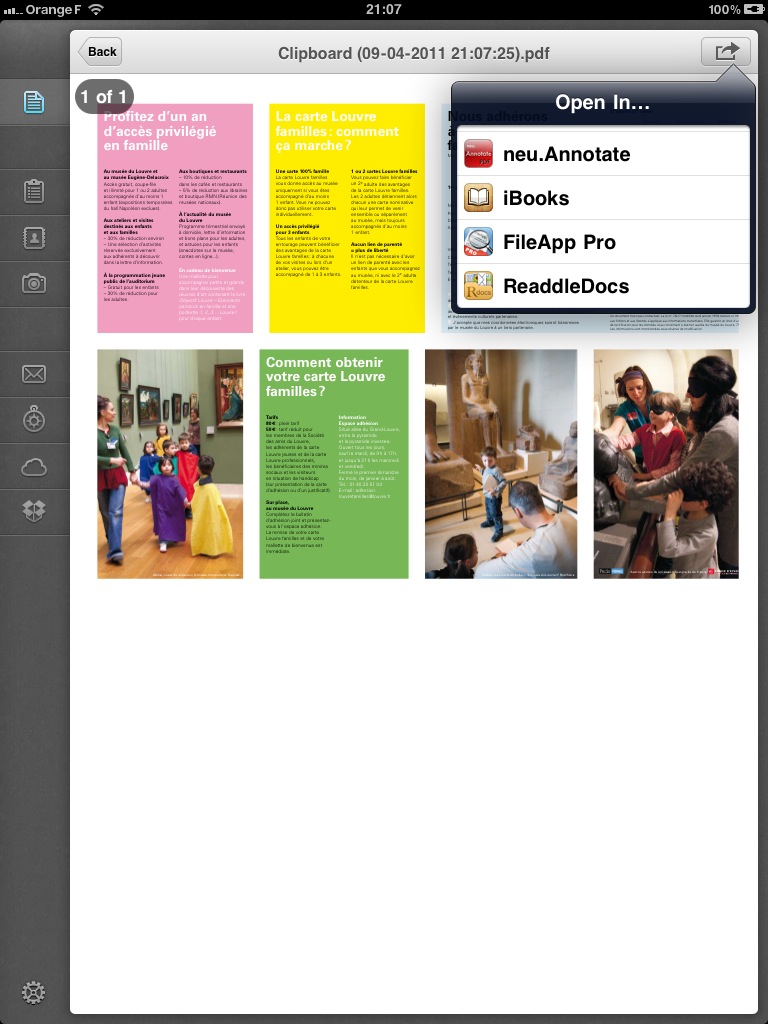 La difficulté pour traiter les différents types de documents, c’est que les applis sur l’iPad ne « communiquent » pas toutes entre elles ; il faut donc parfois « ruser ». En effet, elles n’utilisent pas toutes la fonctionnalité offerte par iOS 4, « Ouvrir avec », qui permet depuis une application d’ouvrir un fichier avec une application compatible. Lorsque cette fonctionnalité n’est pas accessible, on peut par exemple s’envoyer par mail un document, de façon à utiliser la fonctionnalité « Ouvrir avec » de l’application Mail.