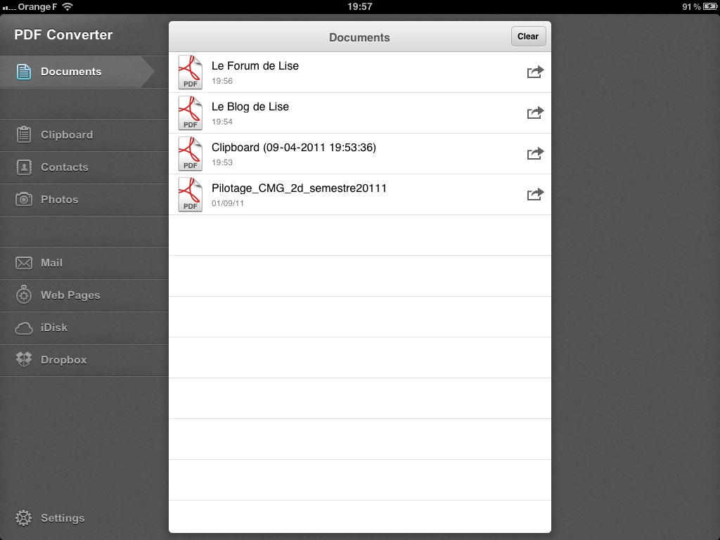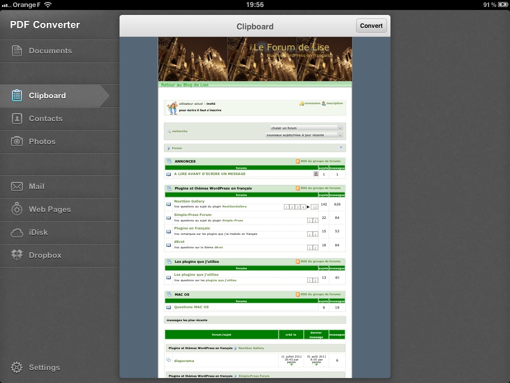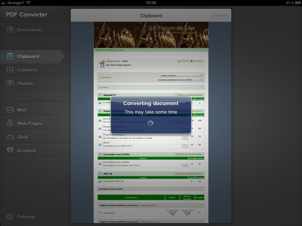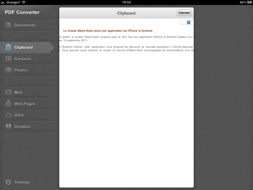 Une fois les documents affichés dans l’onglet Clipboard (presse-papier), un tap sur le bouton Convert effectue la conversion du fichier en PDF.