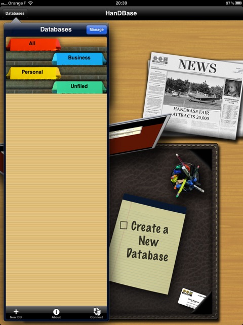 Lorsqu’on ouvre HandBase pour iPad pour la première fois, les bases de données « exemple » s’affichent, aussi bien en mode portrait qu’en mode paysage.