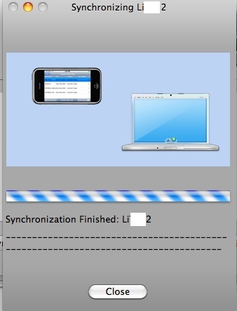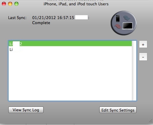 - pour effectuer une synchronisation, lancer l’application sur l’iPad, cliquer sur l’icône de synchronisation, sur le Mac cliquer dans le menu sur Devices > Sync/Configure iPhone Devices, puis sur le gros bouton gris ; cliquer ensuite sur Continue (si l’adresse https://xxx.xxx.xxx.xxx:8080 n’apparaît pas, la saisir pour lancer la synchronisation) ;