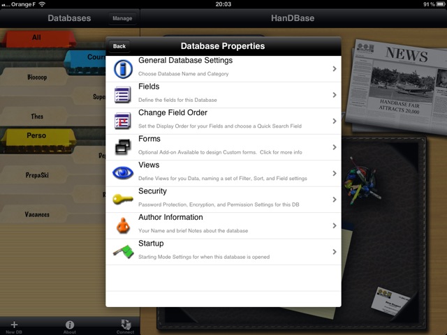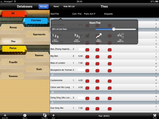 Comme sur l’iPhone, mais de façon plus confortable, on peut aisément modifier l’apparence de ses bases de données. On peut élargir ou réduire les colonnes, afficher différentes vues, supprimer des bases de données, etc.