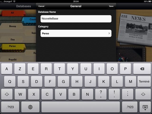 Pour créer une base de données, logiquement, il faut effectuer un tap sur le ‘+’ dans la partie gauche de l’écra, choisir les paramètres généraux (General settings), donner un nom à la base de données et choisir dans quelle catégorie la placer, puis définir les champs souhaités (Fields) et leur type (texte, nombre, case à cocher, date, etc.).