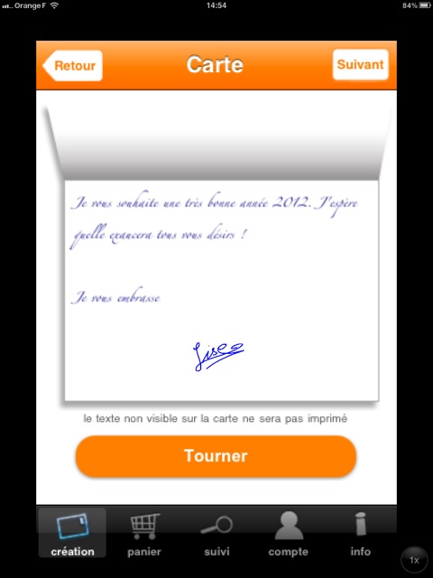 Seule Popcarte permet de réaliser des cartes doubles qui seront envoyées sous enveloppe, de sélectionner une police, d’en choisir la taille et la couleur, d’adopter une couleur spécifique pour la signature.