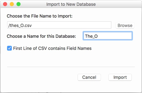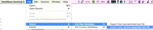 Depuis HandBase Desktop sur le Mac, j’ai choisi d’importer ce fichier csv dans une nouvelle base de données comme fichier texte séparé par des virgules (image 1 – l’autre option d’importer un fichier délimité par des tabulations ne fonctionnait pas). J’ai ensuite nommé la base de données (image 2) ; l’importation s’est réalisée avec l’ensemble des données (dernière image).