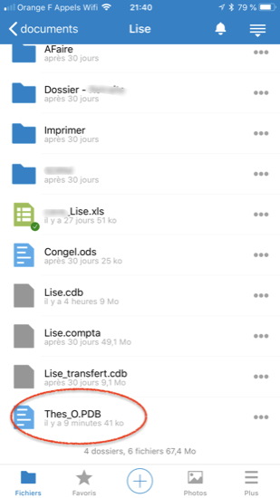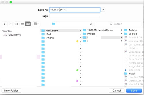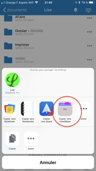 Sur le Mac, j’ai copié le fichier HandBase PDB ainsi obtenu dans le répertoire Nextcloud, puis, une fois la synchro (automatique) réalisée sur le serveur, lancé l’application du même nom sur l’iPhone. Avec la fonction Partage, je l’ai ouvert sur l’iPhone avec HandBase (images 3 à 4).