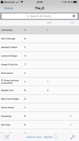 Dans la semaine, je m’étais fabriqué un fichier avec Libre Office pour gérer mes capsules de thés dans deux endroits différents. J’avais enregistré ce fichier sur notre nuage personnel Nextcloud, fichier que j’avais ensuite récupéré sur l’iPhone via l’application Nextcloud. J’avais ensuite pu utiliser ce tableur sur le téléphone avec DocumentsToGo. Mais pour la mise à jour, il est évidemment plus pratique de se servir d’un logiciel de bases de données comme HandBase, que d’effectuer la saisie dans un tableau. J’ai donc converti mon tableur en fichier compatible avec HandBase.