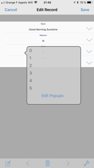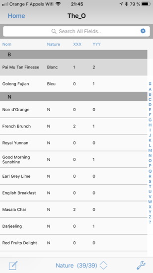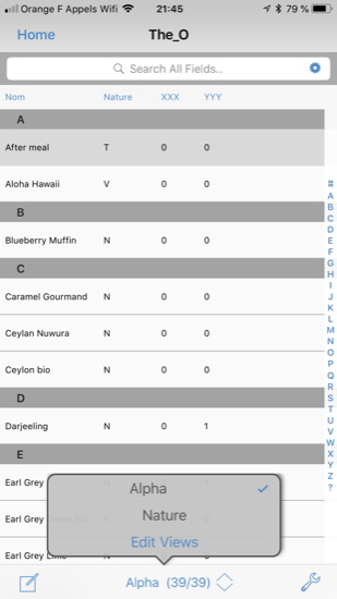 J’ai complété le nom des champs que je n’avais pas rempli sur l’ordinateur (Nom du thé, Nature du thé), créé des vues différentes (affichage par ordre alphabétique ou par type de thés – images 6 & 7), puis défini des listes « popup » pour faciliter la saisie du nombre de capsules (dernière image).