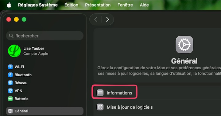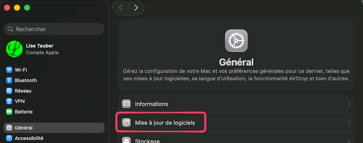 - sélectionner dans la barre latérale Général puis Mise à jour de logiciels,