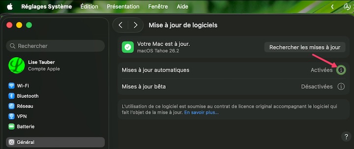 - sur la ligne Mises à jour automatiques, cliquer sur le i à côté d’Activées,