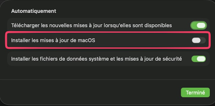 - puis basculer l’interrupteur Installer les mises à jour de macOS ;