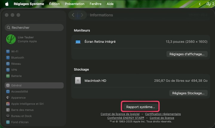 - aller jusqu’en bas de la fenêtre et cliquer sur Rapport système…