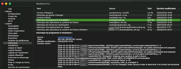 - faire défiler jusqu’à l’item Logiciel, cliquer sur Historique puis sur Historique du programme d’installation, afin de vérifier les dernières mises à jour,