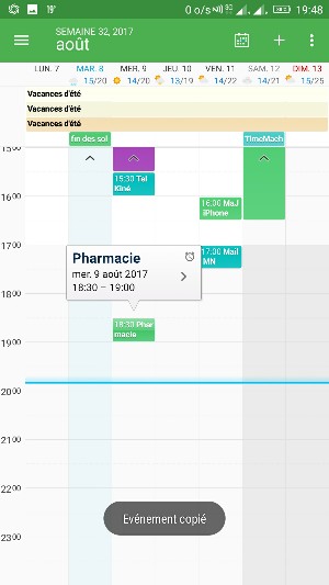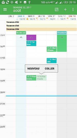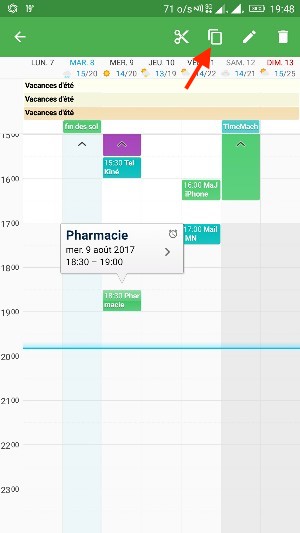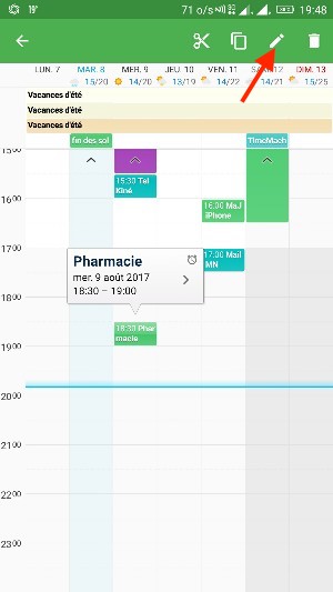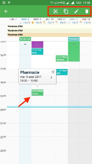 Lorsqu’on effectue un tap sur un événement, une barre d’outils s’affiche en haut de l’écran : on peut directement le couper, le copier, le coller, le modifier ou le supprimer