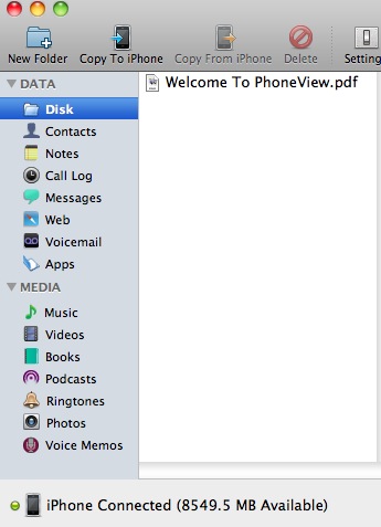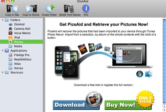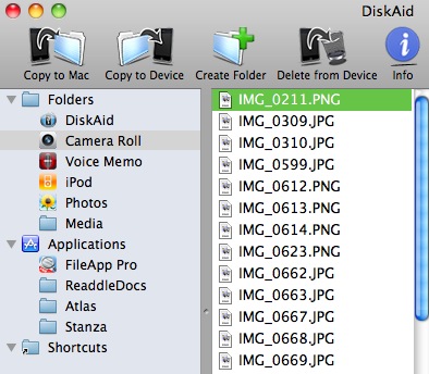 Elle permet de transférer toute sorte de fichiers sur le iPhone, d’accéder aux photos et captures d’écran effectuées sur le iPhone, dès l’appareil connecté à l’ordinateur ; mais pour accéder aux galeries photos, PicsAid est nécessaire. Contrairement à PhoneView, l’application n’affiche pas de miniature des fichiers ; en revanche, comme PhoneView, un double clic sur une icône ouvre l’application correspondante sur l’ordinateur.