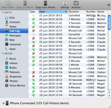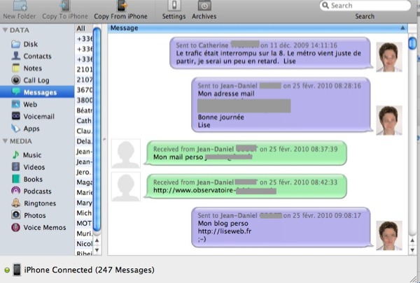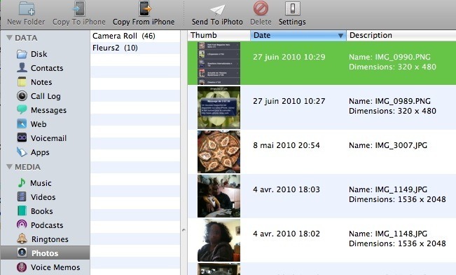 PhoneView est une application commerciale, compatible uniquement avec un ordinateur sous Mac OS ; elle permet d’accéder aux contacts, notes, SMS, appels téléphoniques, photos, vidéos,… ; elle sauvegarde le journal des appels, les SMS. Depuis le passage à iOS4, quelques petits bugs ont fait leur apparition : je ne peux ni supprimer des images depuis le Mac, ni les copier vers le iPhone.