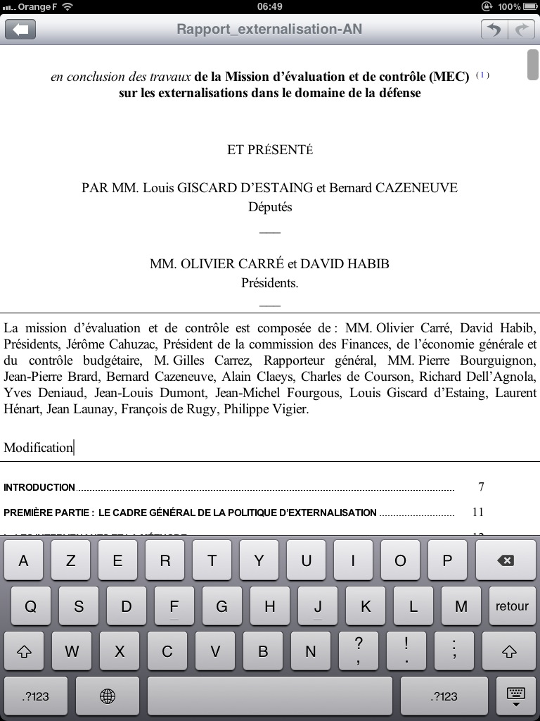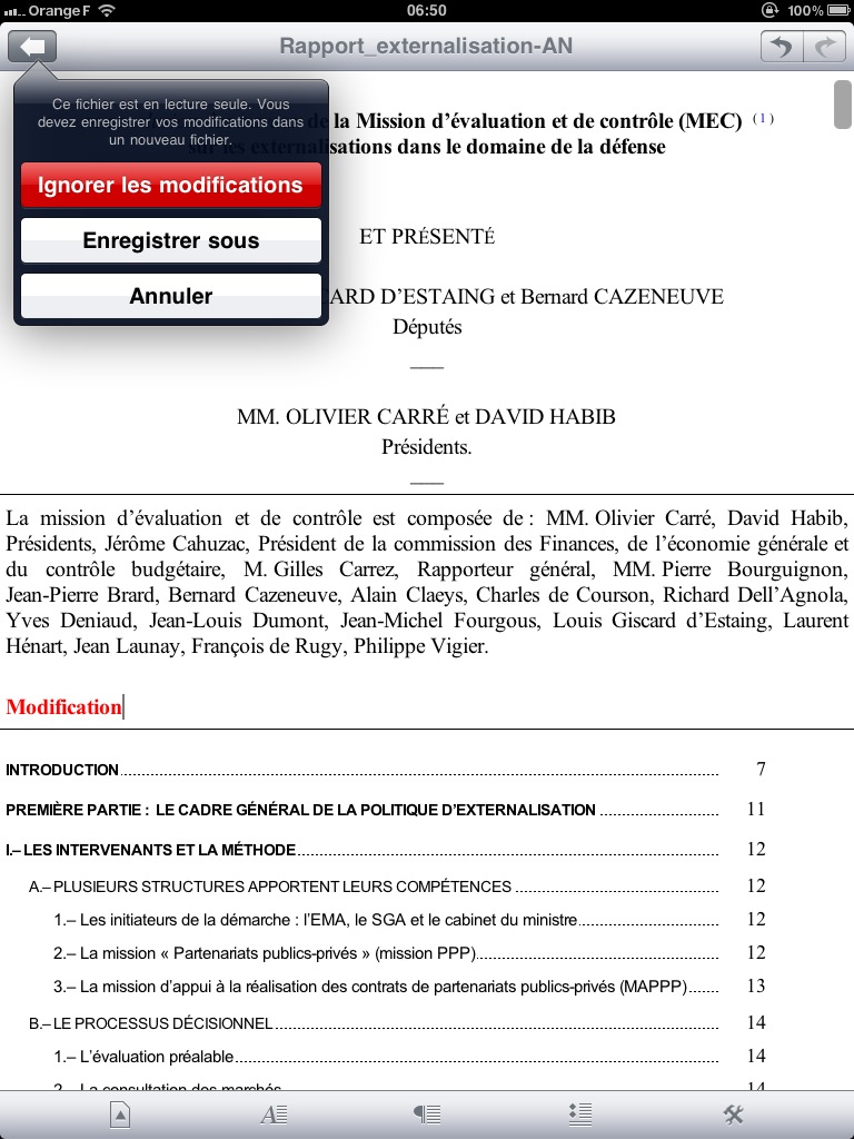 Pour effectuer une modification, il faut effectuer un tap sur l’icône destinée à cet effet ; les modifications d’un fichier créé sur l’ordinateur de bureau ne sont possibles que pour les éléments de texte, mais pas pour les schémas ni les tableaux. Les modifications des commentaires sont facilement accessibles.