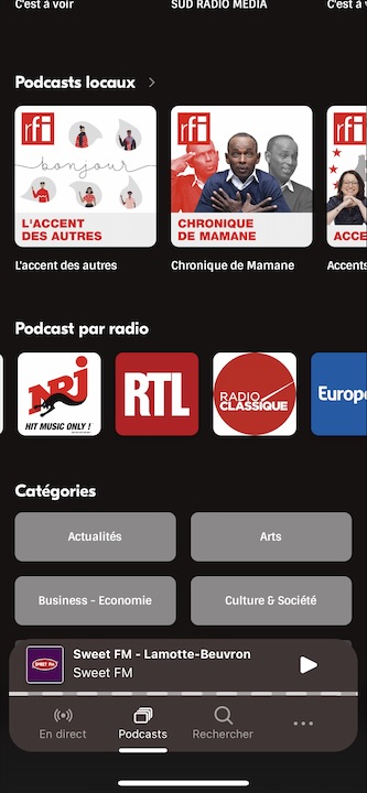 L’appli fonctionne bien, mais il est dommage qu’elle ne dispose d’aucune grille de programme, et qu’on ne sache pas ce qui est à l’écoute (d’où mes tests avec Shazam (1) 🙂 ). Il est donc nécessaire d’accéder aux pages web des stations. Par ailleurs, il n’est pas possible de regrouper les podcasts dans des dossiers.