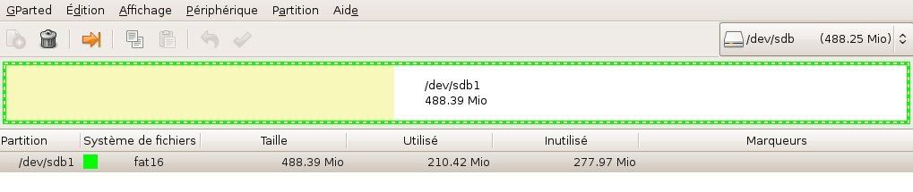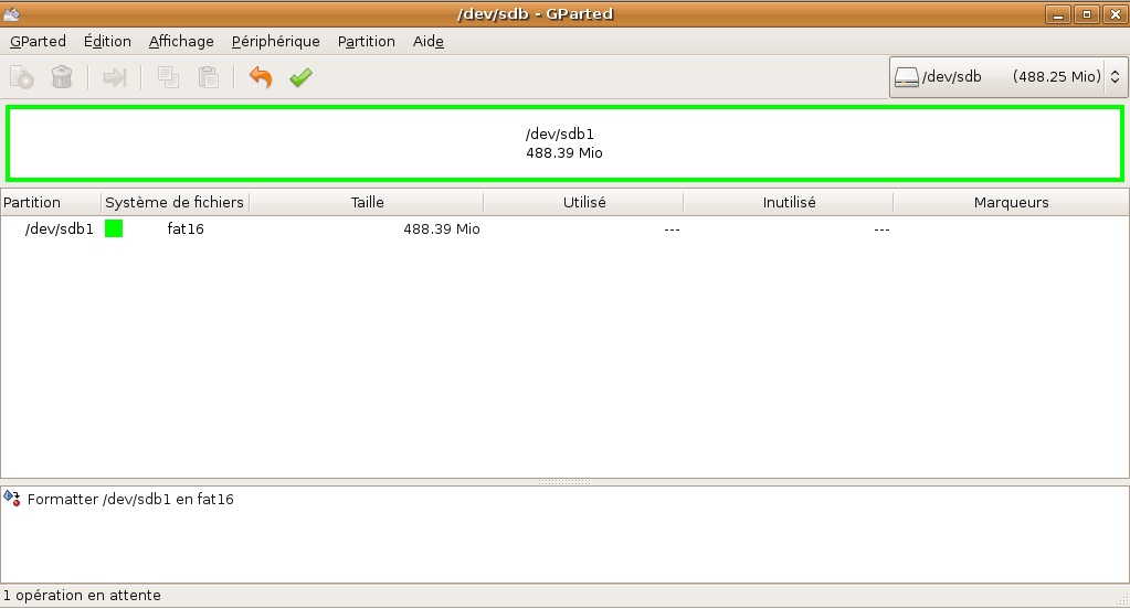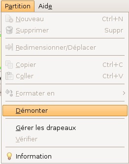 - cliquer sur la partition à formater, puis dans le menu sur Partition > Démonter ;