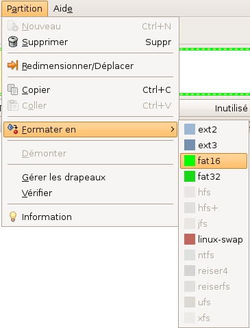 - cliquer de nouveau sur la partition à formater, puis dans le menu sur Partition > Formater en et choisir le format à utiliser ;