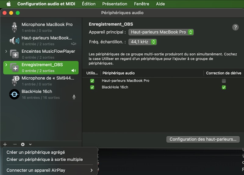 J’ai ensuite essayé de n’enregistrer que de l’audio. Le son enregistré avec cette simple installation est celui des hauts-parleurs du MacBook ! et non pas le son interne ! J’ai donc réinstallé BlackHole, recréé un périphérique à sortie multiple dans l’application Configuration audio et MIDI, sélectionné Blackhole et les périphériques de sortie que je souhaite utiliser, soit les hauts-parleurs du MacBook, soit les enceintes LG (image 1).