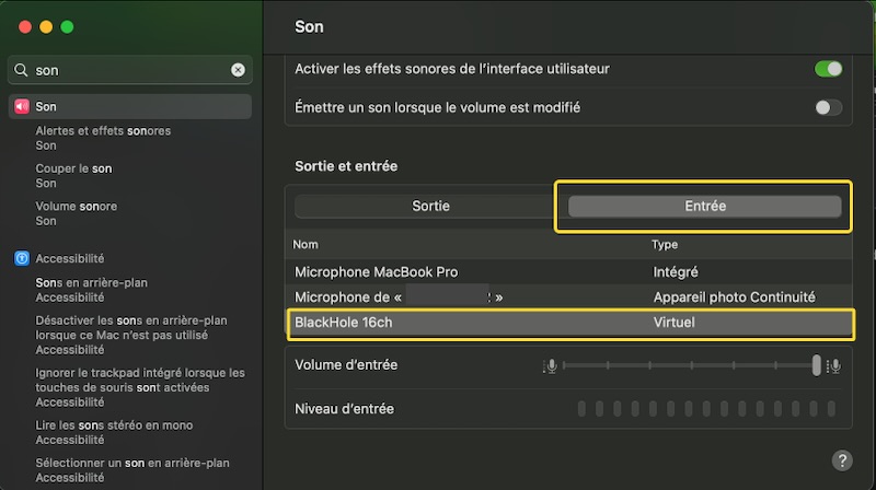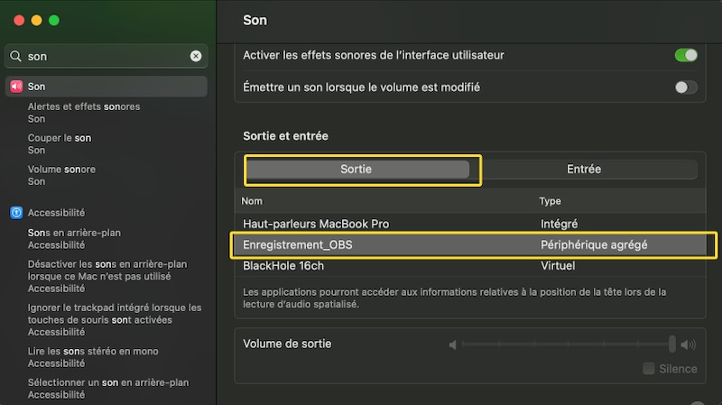 - allez dans les Réglages du Mac, sélectionnez le menu Son, puis l’onglet Sortie ; sélectionnez le périphérique à sorties multiples précédemment créé (image 2) ; dans les paramètres d’entrée, sélectionner BlackHole 16ch
