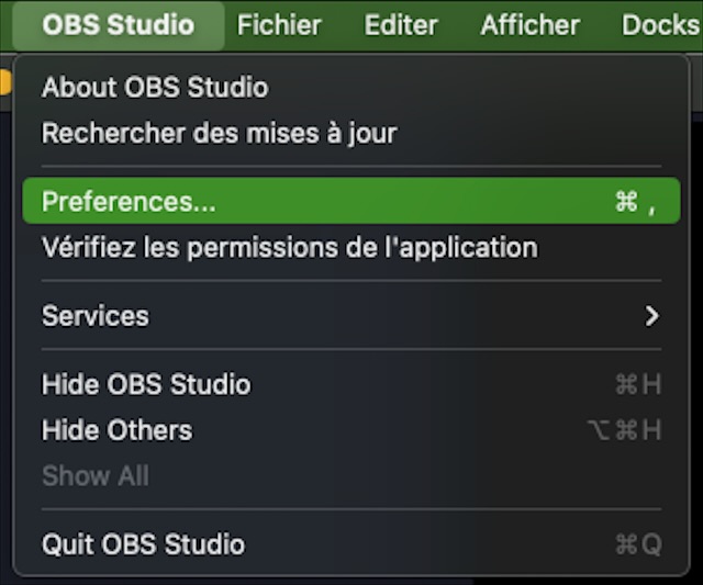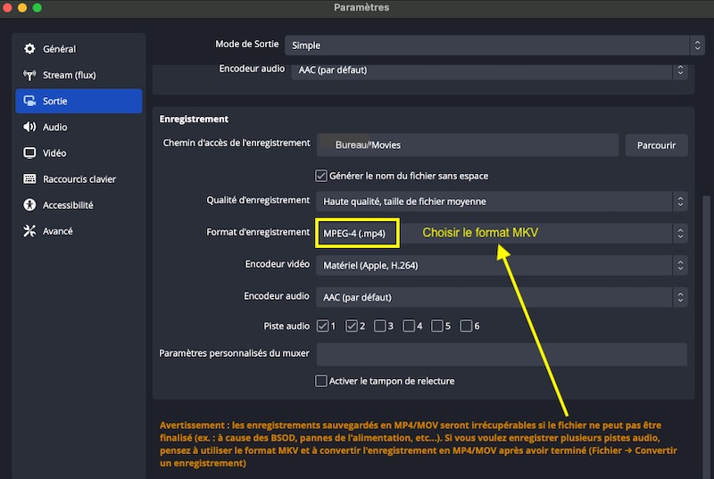 Ouvrez les préférences de OBS Studio (image 1), sélectionnez le répertoire où seront enregistrés les fichiers audio et vidéo, et le format (image 2) ; il est conseillé de conserver le format MKV, l’exportation au format .move ou .mp4 s’effectue par la suite très facilement.