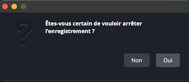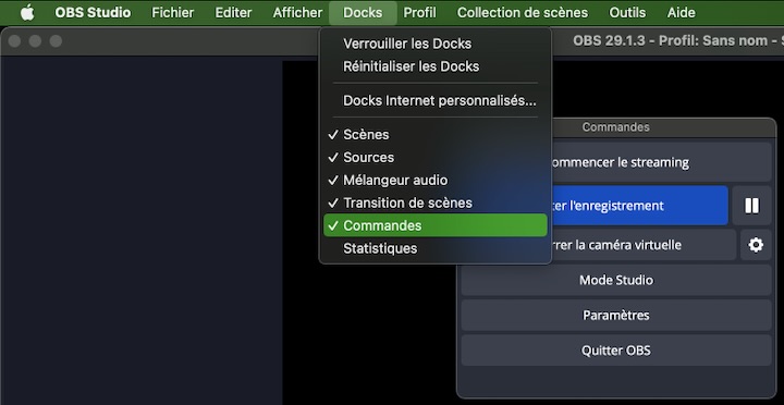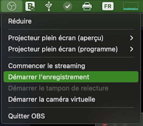 Pour commencer un enregistrement, allez dans le menu Dock > Commandes pour afficher la fenêtre de commandes (image 1), qu’on peut laisser en permanence active, pour lancer ou arrêter l’enregistrement (image 2). On peut également depuis l’icône de la barre de menu démarrer/arrêter un enregistrement (image 3). Pour accéder au fichier vidéo, on sélectionnera, une fois l’enregistrement terminé, dans le menu Afficher > Afficher les enregistrements (images 4 & 5).