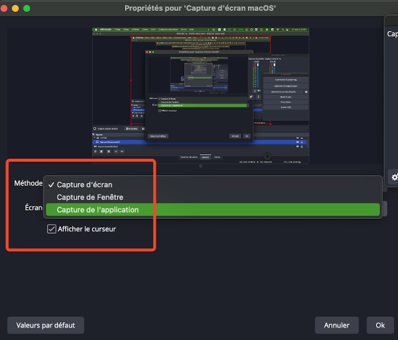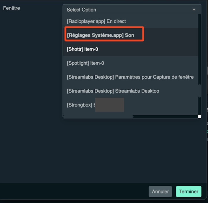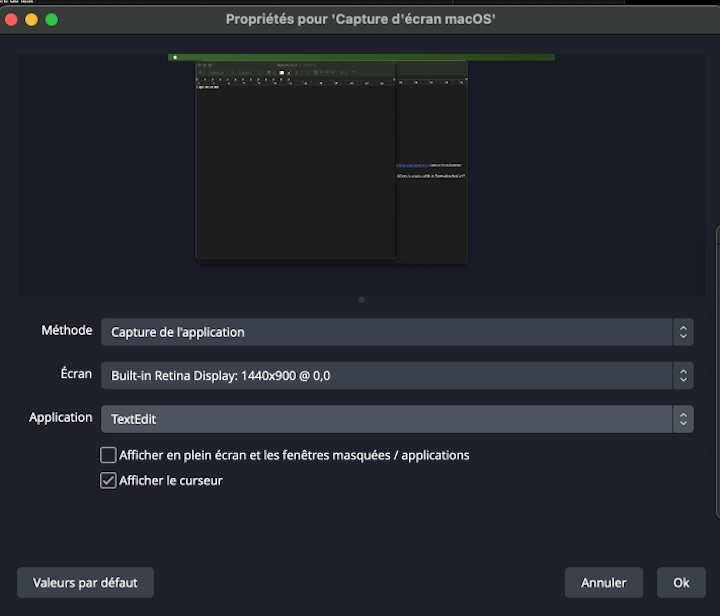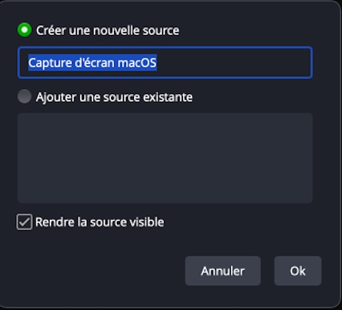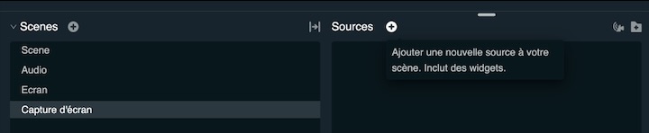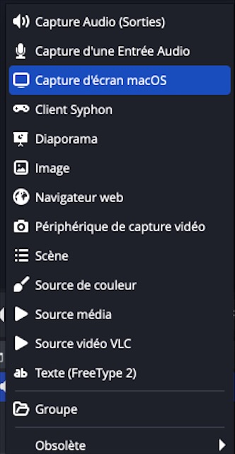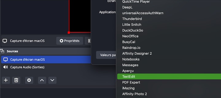 Dans le bas de l’écran, se trouve une fenêtre Sources. Effectuez un tap sur le ‘+’ (image 1), sélectionnez le type de capture (ici, images 2 et 3, je réalise une capture vidéo de l’écran du Mac). Donnez un nom à cette fonction (image 4). Sur l’écran suivant (image 5), cliquez sur Capture d’écran afin de sélectionner l’application que vous souhaitez enregistrer. Ici, je choisis Text Edit (images 6 & 7).
