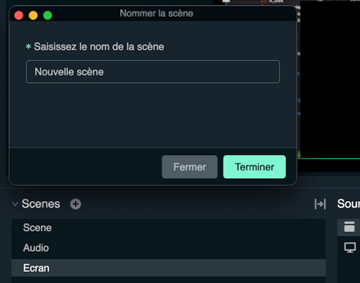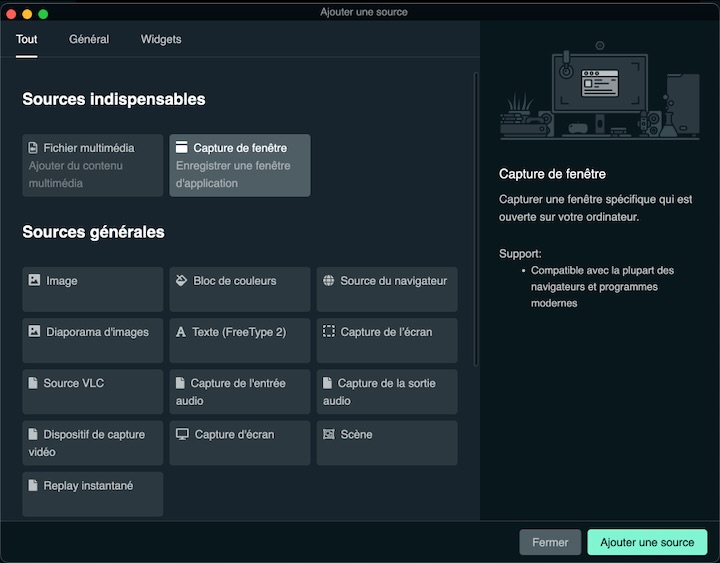 Il faut créer des Scènes (images 1 à 3) pour lesquelles on configure une source (image 4). Pour enregistrer son écran, on peut choisir Capture d’écran ou Capture de fenêtre (image 5) ; on sélectionne ensuite l’application que l’on veut enregistrer. S’affichent alors les apps ouvertes (image 6). On peut ensuite modifier la taille de la fenêtre d’enregistrement.