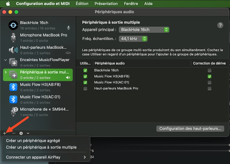 - ouvrez l’application de Configuration audio et Midi présente sur tous les Macs et ajouter un nouveau périphérique à sorties multiples (cliquez sur le + en bas de l’écran et choisir Créer un périphérique à sorties multiples ; configurez les paramètres comme indiqué dans la première capture d’écran ci-dessous ;