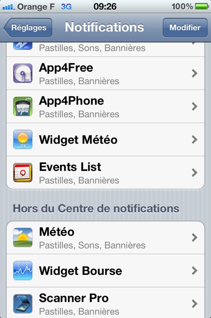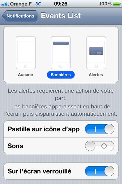 Une fois Events List installée sur son iPhone ou son iPad, il faut aller dans Réglages > Notifications et préciser la façon dont les événements seront affichés, et s’il doivent l’être sur l’écran verrouillé.