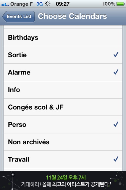 Dans l’application elle-même, on choisit les calendriers, le nombre d’événements à afficher, et si la mise à jour s’effectue automatiquement.