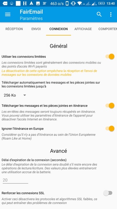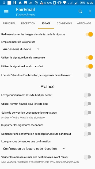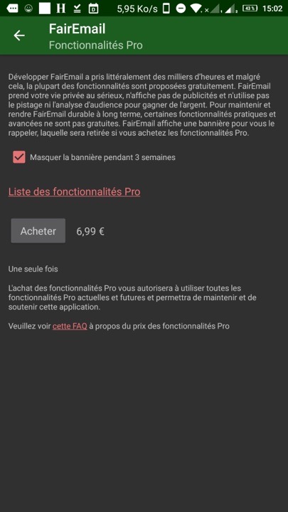 FairEmail est un client mail pour Android, Open Source et gratuit. La plupart des fonctions sont utilisables avec la version gratuite, certaines d’entre elles ne sont accessibles qu’en achetant une licence à 6,99 €, pour soutenir le développeur.