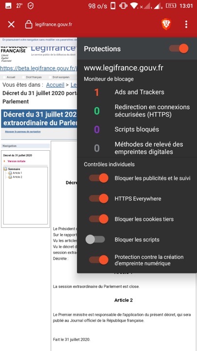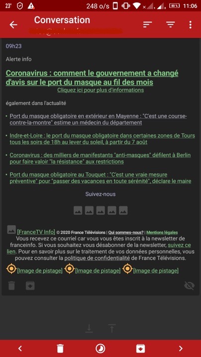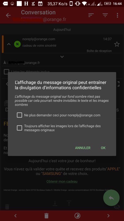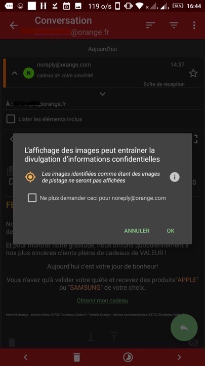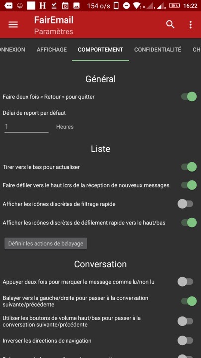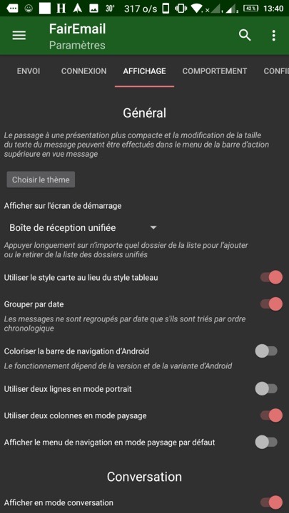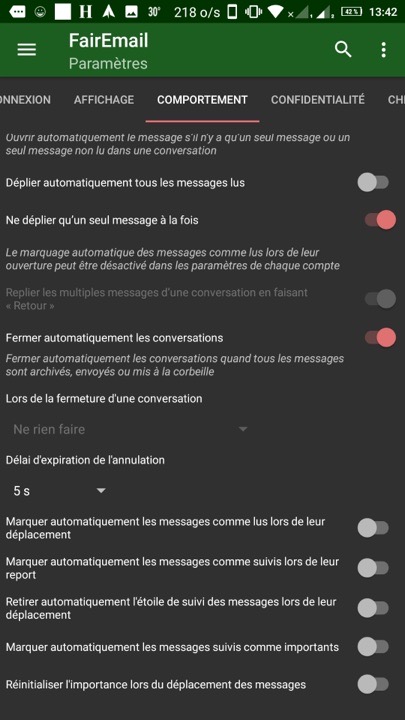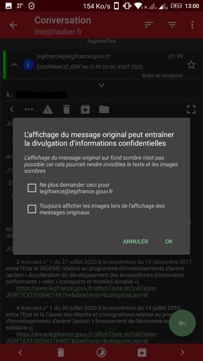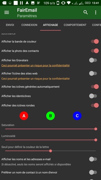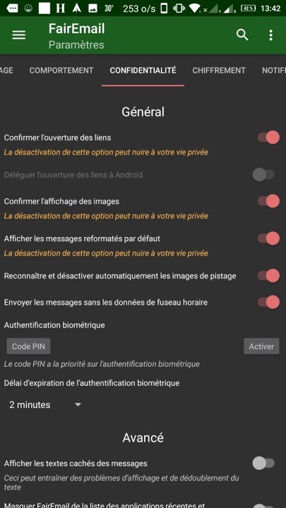 Les options de protection de la vie privée sont plutôt complètes : confirmation de l’ouverture de liens, confirmation de l’affichage des images, affichage des messages en texte non formaté, reconnaissance des images de pistage, activation de la reconnaissance de l’empreinte digitale et/ou du code PIN.