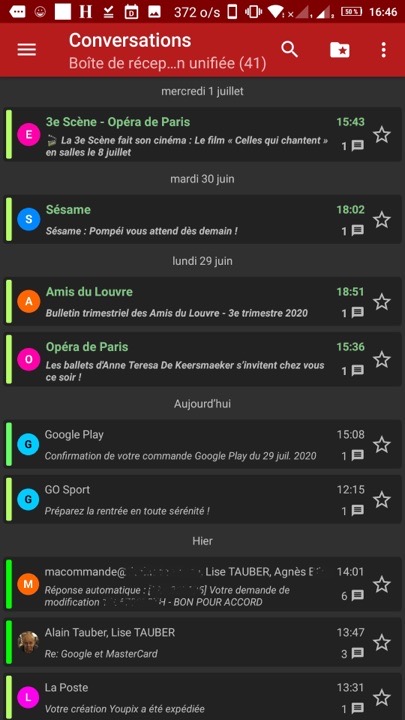 Les messages non lus restent au-dessus des autres, classés par date (ici marqués en gras et en vert). On peut choisir d’afficher une boîte de réception unifiée, les messages en mode conversation.